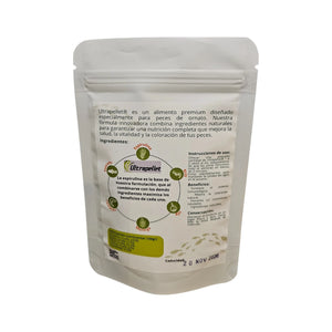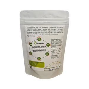 El alimento de Ultrapellet, es un alimento no comercial, es hecho artesanalmente. Contiene espirulina, proteína de pescado, camarón, krill, insectos, trigo, soya y moringa.