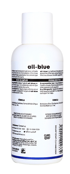 All-Blue es una formulación tradicional utilizada para la prevención de enfermedades infecciosas causadas por hongos y parasitarias más comunes que afectan a los peces de acuario.