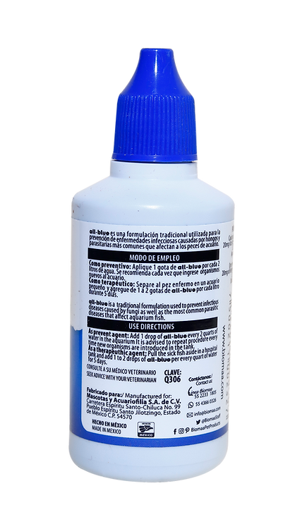 All-Blue es una formulación tradicional utilizada para la prevención de enfermedades infecciosas causadas por hongos y parasitarias más comunes que afectan a los peces de acuario.